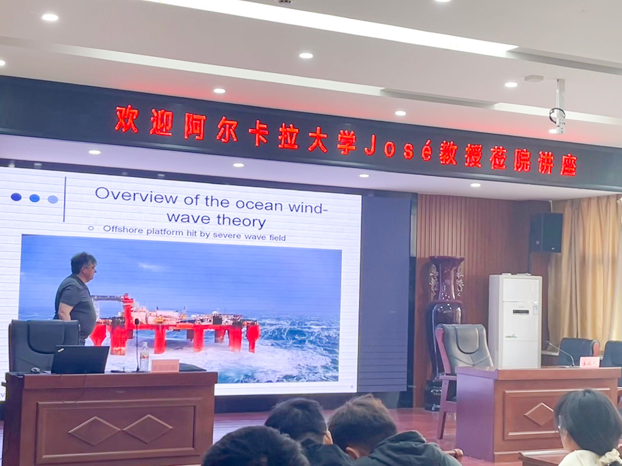 报告伊始,José教授以生动的影像资料切入,系统阐释了海洋波浪的生成机制与核心物理特性。通过构建波高、波长、周期等关键参数的数学模型,揭示了海浪能量传递与海洋环境变化的深层关联。其深入浅出的讲解使在场师生快速建立起对海洋动力学的系统性认知。