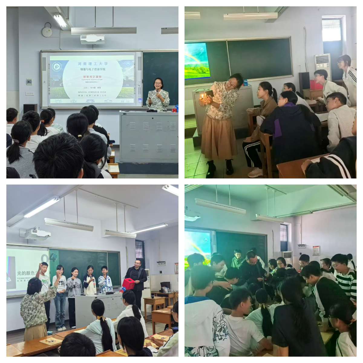 为配合焦作市解放区“人工智能赋能科学教育——走进中小学活动”,9月26日下午,物理系党支部联合应用物理系党支部走进焦作市第十中学,开展“探索光之奥秘”科普实验志愿服务活动。这是该院继“光的奇妙旅行”之后推出的物理科普系列第二站,也是学院党委“党建+科普”品牌创建的重要一环。本次活动由张书霞老师主讲,胡强老师负责实验演示。