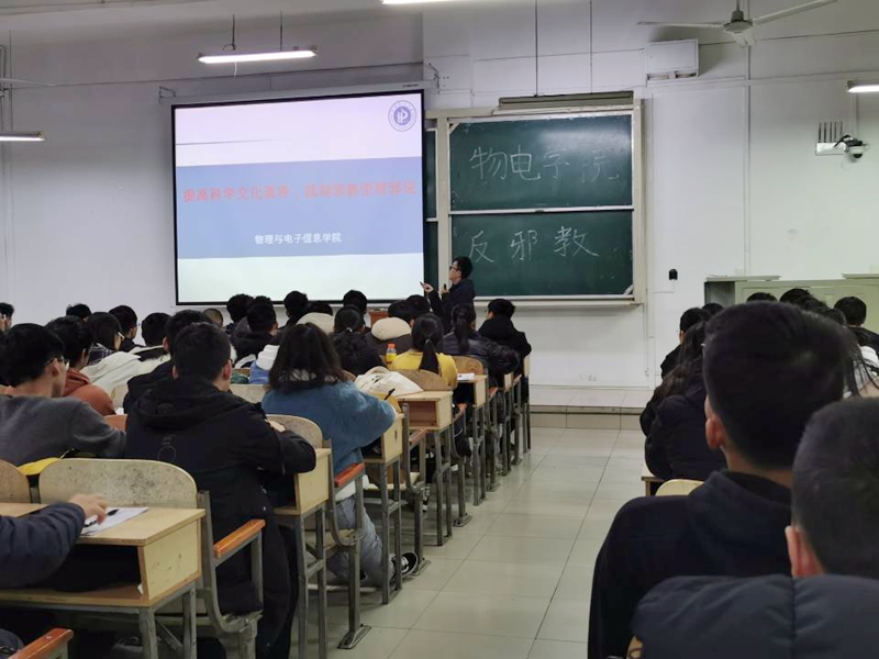 此次活动以“提高科学文化素养,抵制邪教歪理邪说”为主题,以讲座的形式开展。2019级专职辅导员荀伟高作为主讲人,用日常生活的例子,介绍了什么是邪教、邪教的种类、如何反对和抵制邪教等方面,特别针对我国邪教组织的歪理邪说、社会危害、活动特点等方面进行了深入细致的阐述。