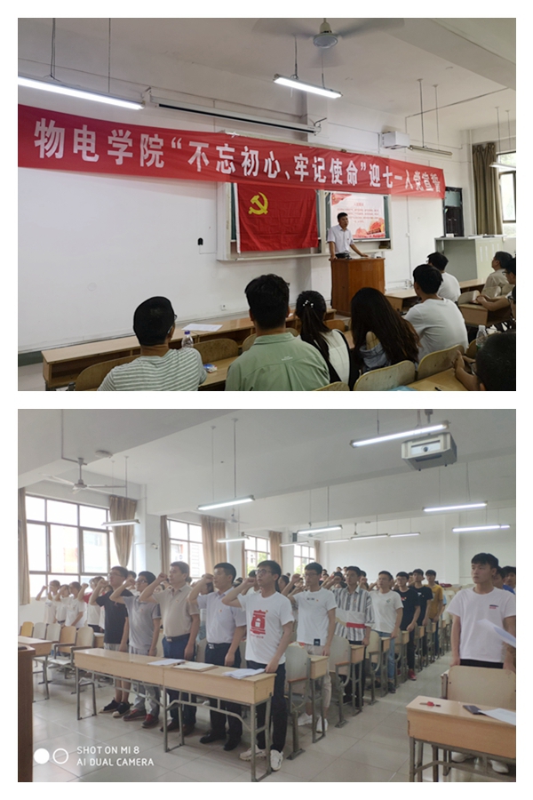 为庆祝中国共产党成立98周年,弘扬党的优良传统,对党员进行党性教育,明确在新形势下共产党员肩负的责任,6月25日下午,学院组织开展“不忘初心、牢记使命”迎七一入党宣誓活动,党委书记王书卿、党委副书记张洪良、专职组织员、辅导员、学生正式党员、预备党员及发展对象、入党积极分子代表等参加了宣誓活动。