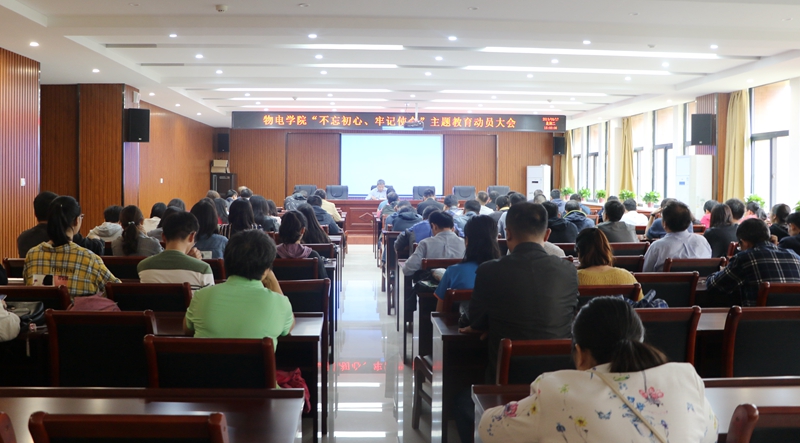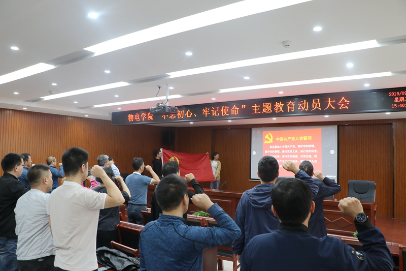 王书卿作动员讲话。他指出,在新中国成立70周年之际开展“不忘初心、牢记使命”主题教育,是以以习近平同志为核心的党中央作出的重大部署。全院师生党员要提高政治站位,深刻认识开展主题教育的重大意义。切实把思想和行动统一到习近平总书记重要讲话、省委王国生书记和学校党委邹友峰书记讲话精神上来,统一到中央、省委和学校党委的决策部署上来,以高度的政治自觉、思想自觉和行动自觉开展好这次主题教育。全院师生党员要坚持善作善成,把高标准高质量贯穿主题教育全过程,把握总要求,聚焦根本任务,紧扣具体目标,强化重点措施,要紧扣物电学院发展瓶颈和短板,聚焦广大教职工反映强烈的突出问题,切实做到眼到脑到,脚到心到,摸清情况,抓住症结,多想“如何办、怎么办”的方法和点子,少找“办不成、很难办”的理由和借口,把调查研究的过程变成理清思路、达成共识,形成合力、解决问题的过程,以推进学院高质量发展的成果来检验工作成效。