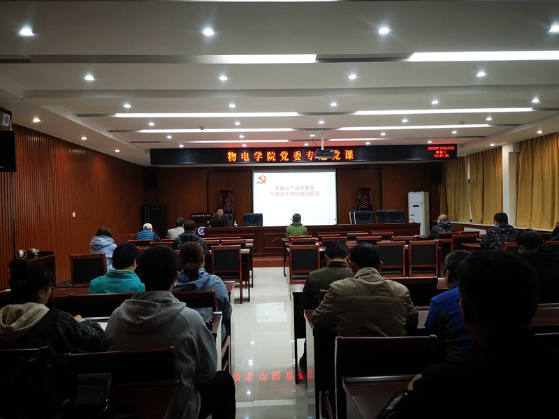 为坚定不移推进全面从严治党,持续营造学的氛围、严的氛围、干的氛围,结合开展经常性廉洁教育、法制法规教育活动及2020年党支部书记培训要求,10月27日,学院党委在院会议室开展专题党课活动,邀请校纪委副书记李照修讲《全面从严治党要求与基层支部的政治担当》专题党课,学院全体教工党员及部分学生党员参加了党课学习,会议由党委书记王书卿主持。