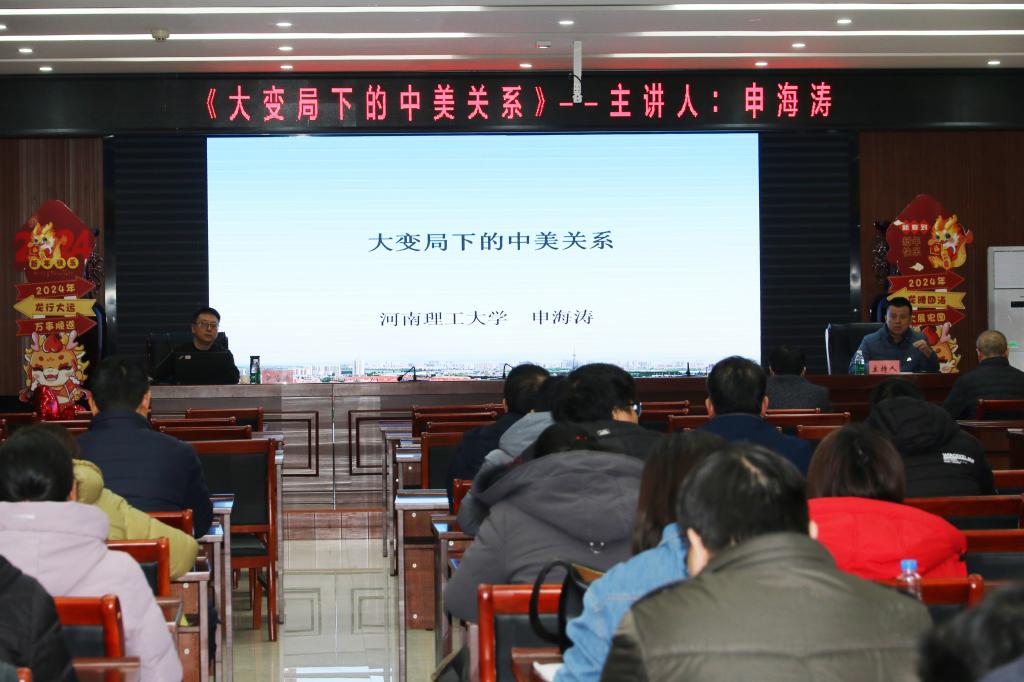 根据学院2024年寒假培训安排,为帮助学院教师更好的了解当前国际形势,坚定历史自信,增强历史主动,1月16日下午,我院邀请河南省委宣传部青年理论宣讲专家、马克思主义学院副教授申海涛作题为《大变局下的中美关系》的报告。本次会议由学院副院长吴君主持,全体教师参加培训。