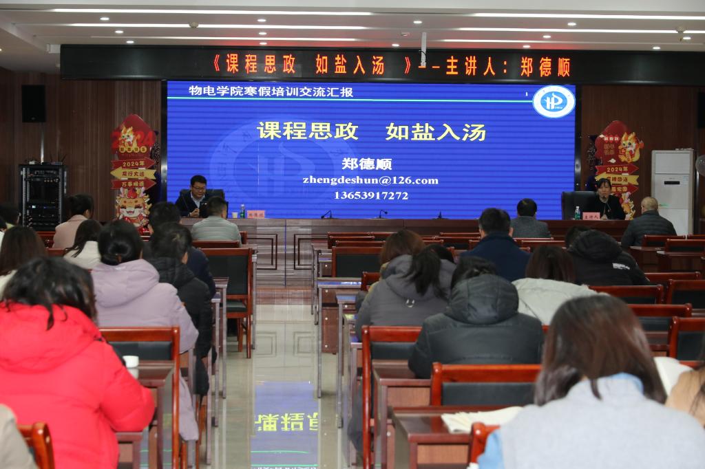 根据学院2024年寒假培训安排,为落实立德树人根本任务,推动思政与课堂相结合,1月15日下午,我院邀请河南省高校教学名师、资环学院副院长郑德顺教授作题为《课程思政,如盐入汤》的报告。会议由副院长曹国华主持,全体教师参加培训。