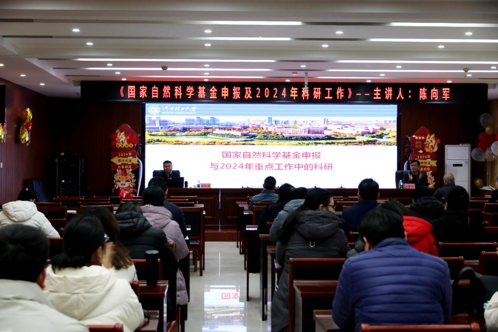 培训中,陈向军教授首先对我校近几年国家自然科学基金项目申请和获批情况做了介绍。然后从自身申报经历出发,分享个人申报的心得体会,并围绕基金改革措施、基金选题和申请书写作要点,对项目选题依据、研究背景、研究内容、研究方案、关键科学问题、创新特色、研究基础及可行性分析等各方面进行了详细精准的讲授,并提出了行之有效的建议,陈向军教授讲授内容实用,讲解生动细致,案例丰富,具有很强的指导意义。最后,陈向军还对学校2024年度科研重点工作做了介绍。