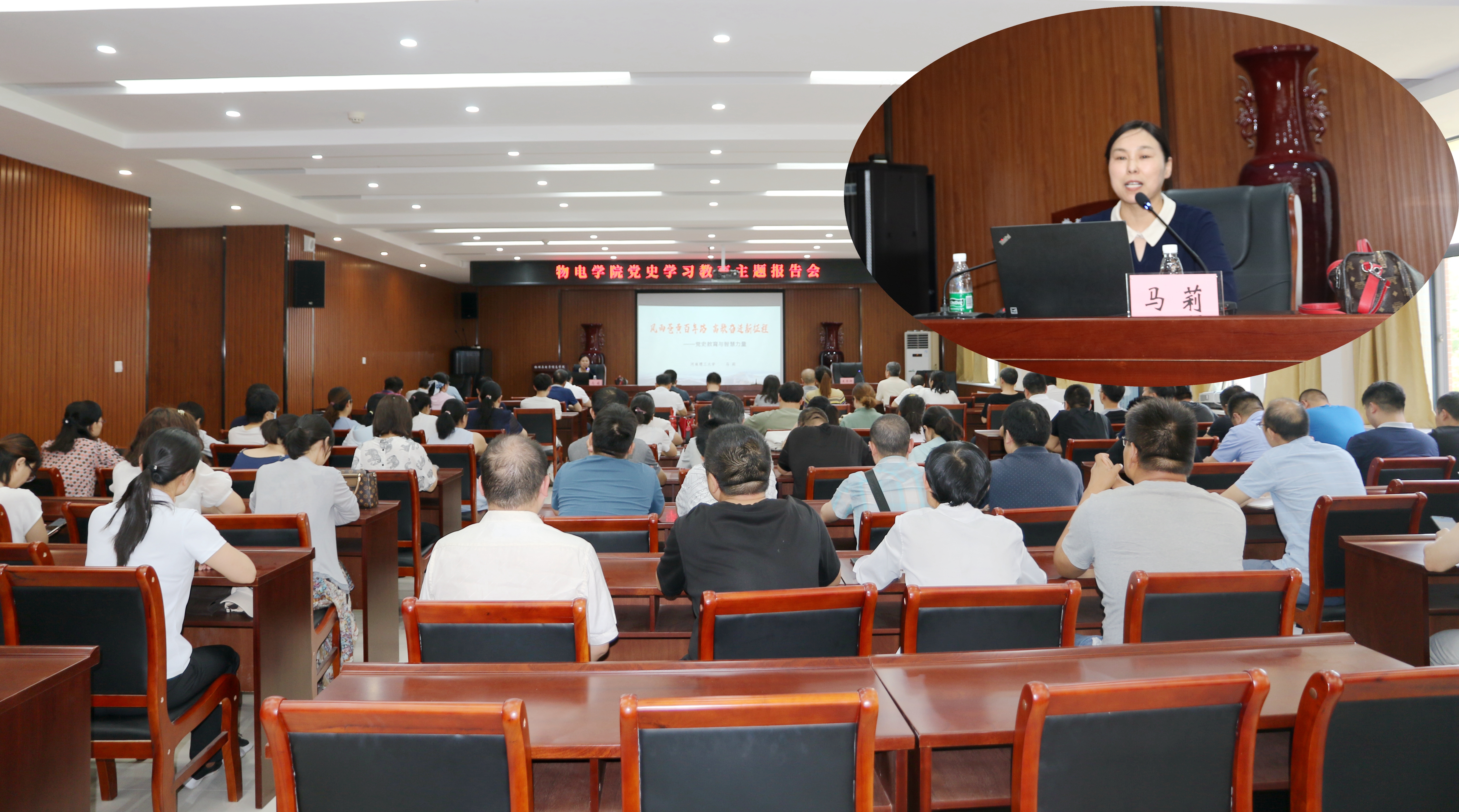 为庆祝中国共产党成立100周年,引领学院党史学习教育扎实有效开展,不断增强党员守初心、担使命的思想意识,6月22日下午,物电学院邀请校宣讲团专家马莉老师在学院226会议室作题为《风雨苍黄百年路 高歌奋进新征程——党史教育与智慧力量》党史学习教育专题报告。学院全体教工参加了本次报告会,报告会由院党委书记王书卿主持。