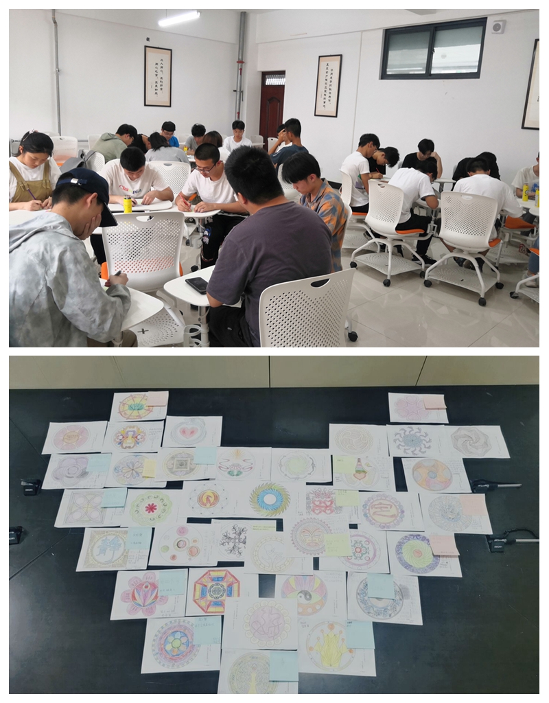 本次活动共分为三个环节,冥想、彩绘曼陀罗、漂流曼陀罗。第一个环节是冥想。通过冥想环节让学生放飞自我、放松身心、悦纳自己、释放压力,调节心境。第二个环节是彩绘曼陀罗。同学们用彩笔在图纸上创作,笔尖与画纸的碰撞激起了学生创意的火花,用色彩诉说着自己内心深处的话语。通过这种无意识的绘画,画者借曼陀罗的意象来进行沉思冥想,全神贯注观照本质自我,整合内心的冲突,从而获得心灵的和谐与安定。第三个环节是漂流曼陀罗。每个同学的作品通过漂流的形势随意的到达其他同学的手里,而收到“漂流”作品的同学根据画面内容给与任何形势文字回应,得到回应后的作品会流回画者手里。漂流曼陀罗,可以加强成员间的动力,促进领悟。自己的故事,借助第三只眼睛的观察,得到灵感和启发,让自己多了一个角度来看世界,转化和疗愈就在这不经意间完成。