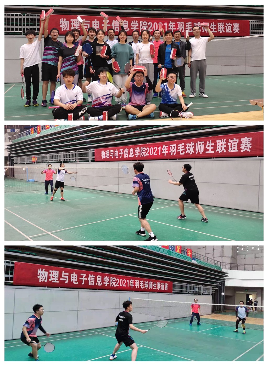 为丰富校园文化生活,增进学院师生感情,锻炼羽毛球队伍,更好地备战我校2021年体育节学生羽毛球比赛,3月28日下午15:00,由我院工会机关分工会、院学生会体育部联合举办的物电学院2021年师生羽毛球联谊赛在校体育馆举行。本次比赛由院教工羽毛球队及院学生羽毛球队共20余人参加。