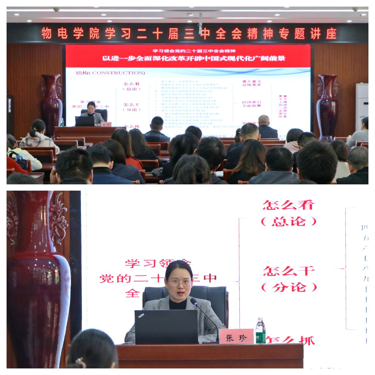 为深入学习和贯彻党的二十届三中全会精神,增强教师的政治意识和理论水平,10月29日,在综合实验楼226会议室,我院举办了学习党的二十届三中全会精神专题讲座。此次讲座由我院党委书记张珍主讲,吸引了学院领导班子成员以及全体教职工的广泛参与。