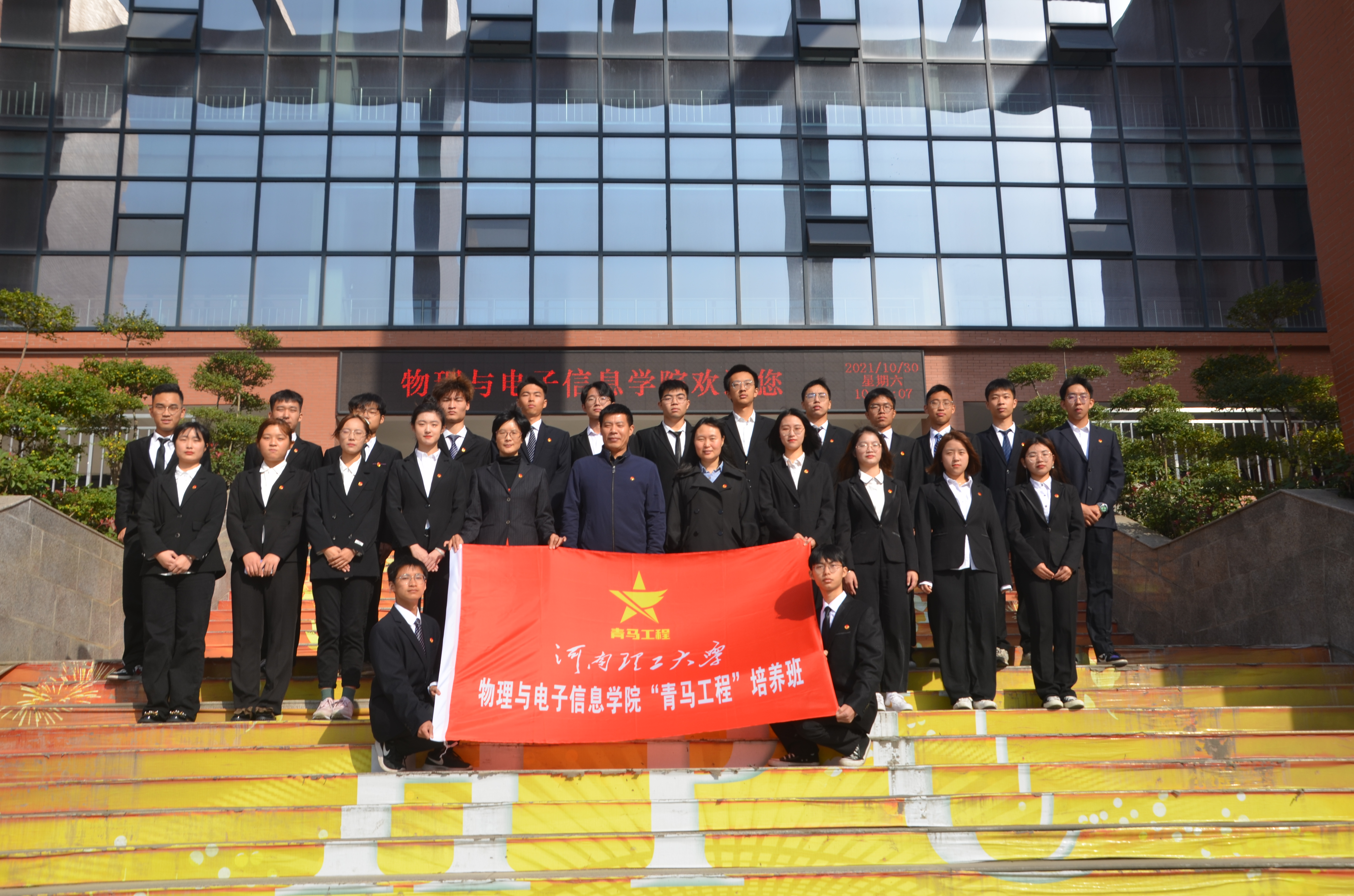 仪式在洋溢着青春气息的共青团团歌中拉开序幕。 开班仪式上,学院往期青马工程培养班优秀学员代表芦毅、本期青马工程培训班代表王佳琦分别发言,表示会持续提升思想认识,不断增强本领素质,做一名合格的马克思主义者,成为社会主义建设的接班人。尚如静宣读《物电学院“青年马克思主义者培养工程”实行办法(试行)》。接着,张洪良对此次青马工程培训班提出了以下几点要求:一是深化理论学习,坚定理想信念;二是加强实践锻炼,增强干事本领;三是紧密联系同学,提高服务意识;四是加强作风建设,发挥示范作用。他希望与会成员能够将在青马工程培训班中所学的理论和知识广泛地在团员青年中进行宣传,通过自身的示范引领把全校团员青年紧紧团结在党的周围,努力成长为模范表率、堪当重任的青年马克思主义者。最后,张洪良为本期“青马工程”培养班授旗,全体成员重温入团誓词,并合影留念。