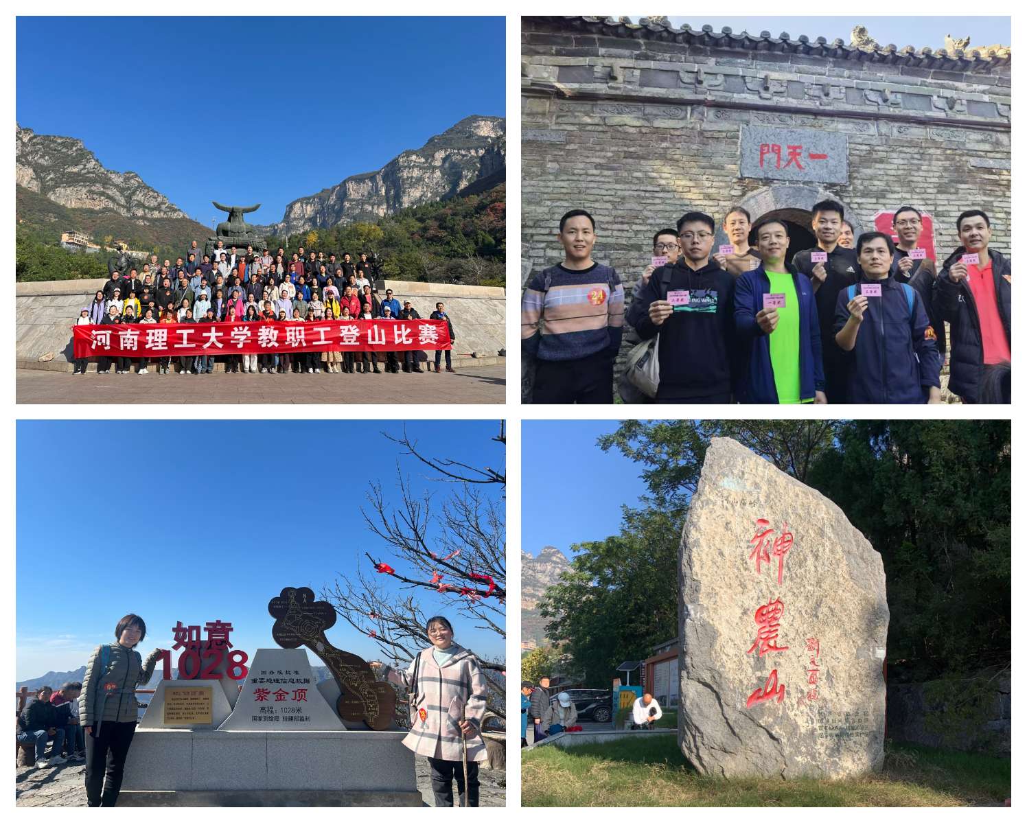 “山明水净夜来霜,数树深红出浅黄。”金秋时节,我校第二十届教职工登山比赛在层林尽染的神农山中拉开帷幕。11月1日,我院史文超、黄高见、武苹苹和梁艳老师组队参加了学校举办的第二十届教职工登山比赛。
