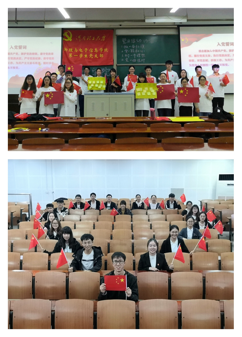 会议伊始,全体人员奏唱国歌,重温入党誓词,庄重严肃的神请和铿锵嘹亮的声音展现了每一位预备党员坚定的信念和不忘初心的态度。此次活动主要分为四部分,第一部分“做一面红旗”,支部成员们共同学习了《红岩》江姐狱中含热泪绣国旗的经典故事,深刻感受革命先辈们为了祖国和人民坚贞不屈的革命精神,之后按照分组5名预备党员一组,共同做一面红旗,弘扬革命精神并为祖国母亲70华诞献礼。第二部分“守一颗初心”,大家共同讨论从国家和个人两个层面上“初心”的含义,不忘为人民服务的初心,不忘奋发向上的初心,之后全体成员手持国旗,共同摆成一个“心”形,表达对祖国的爱。第三部分“树一个理想”,每位成员在便签上写下自己的理想,相信有了理想前行的路更有方向。第四部分“定一份信仰”,中国共产党始终坚持马克思主义的科学信仰,身为一名中共预备党员,必须学习和坚定马克思主义信仰,并坚决以一名合格的共产党员标准严格要求自己。最后,张老师总结了此次党日活动旨在通过党日活动学习党的精神信仰,明确自身理想信念,不忘并弘扬革命精神,同时今后我支部将建立规范化、常态化的党日活动制度,充分发挥党员先锋模范作用。