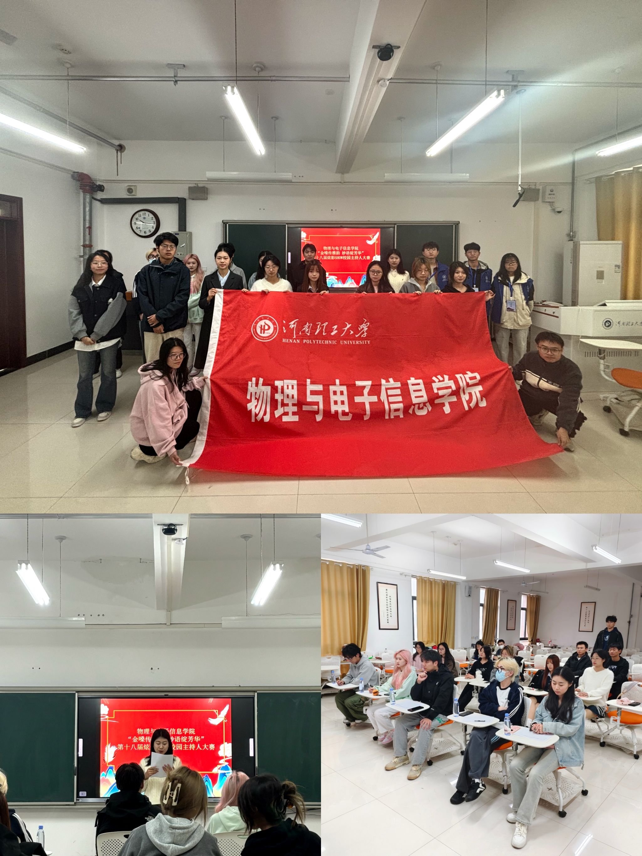 露寒蝉噤,霜冷雁翔。为丰富校园文化生活,响应国家综合发展教育方针,为学生提供才艺展示舞台,2024年10月27日上午,我院于综合实验楼505室开展“金嗓传雅韵 妙语绽芳华”第十八届主持人大赛。校艺术团以及学生会主席团部分成员出席并担任本次比赛评委。