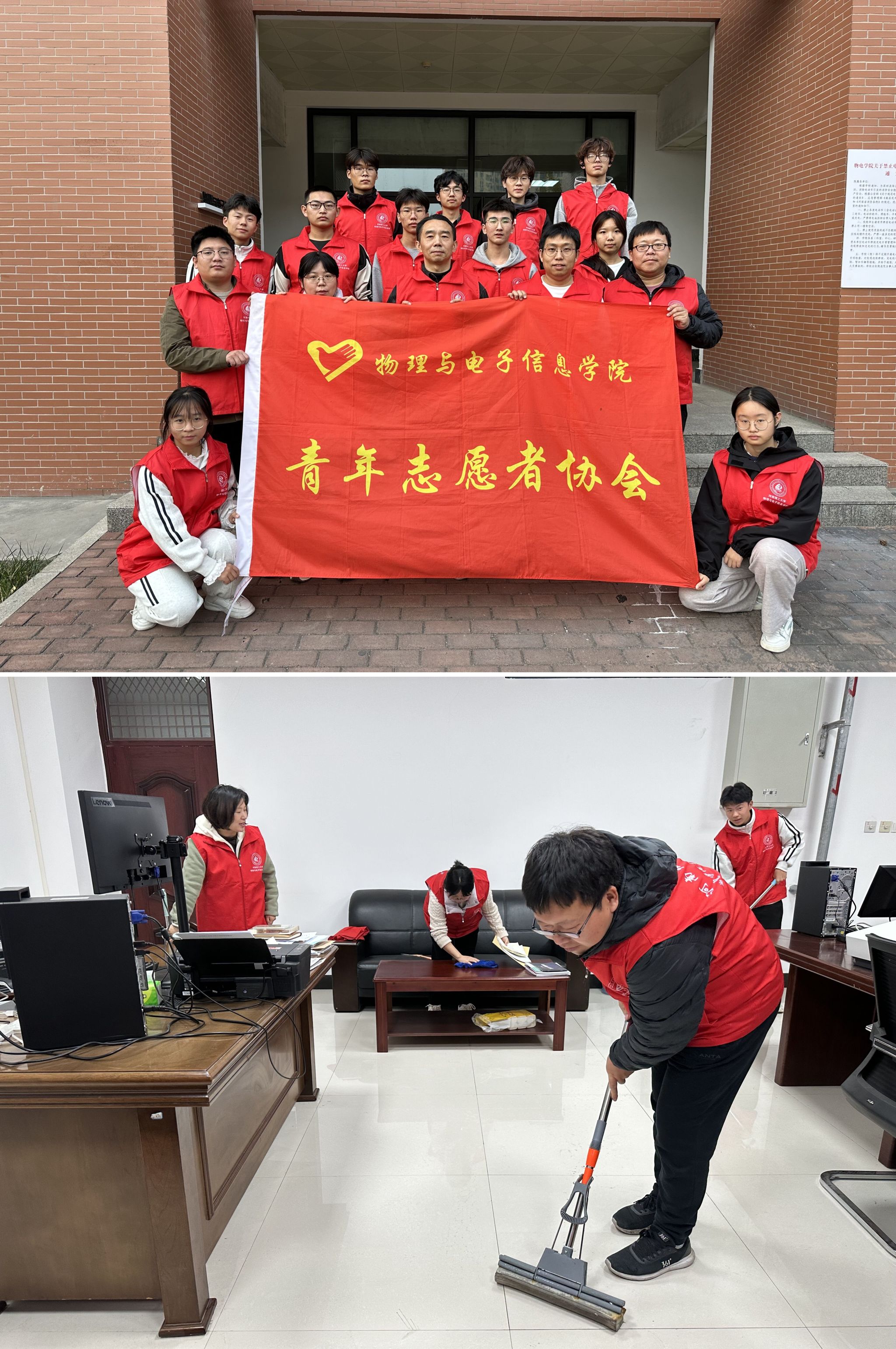 深秋有寒风,风吹叶落,落叶又归根。为教育引导广大师生崇尚劳动,尊重劳动,培育和践行社会主义核心价值观,同时要营造整洁有序、干净舒适的办公环境。11月8日下午,物电学院电信专业党员教师联合青年志愿者协会电信合作办学同学,共同开展了主题为“知识殿堂,清洁先锋”办公室维洁活动。