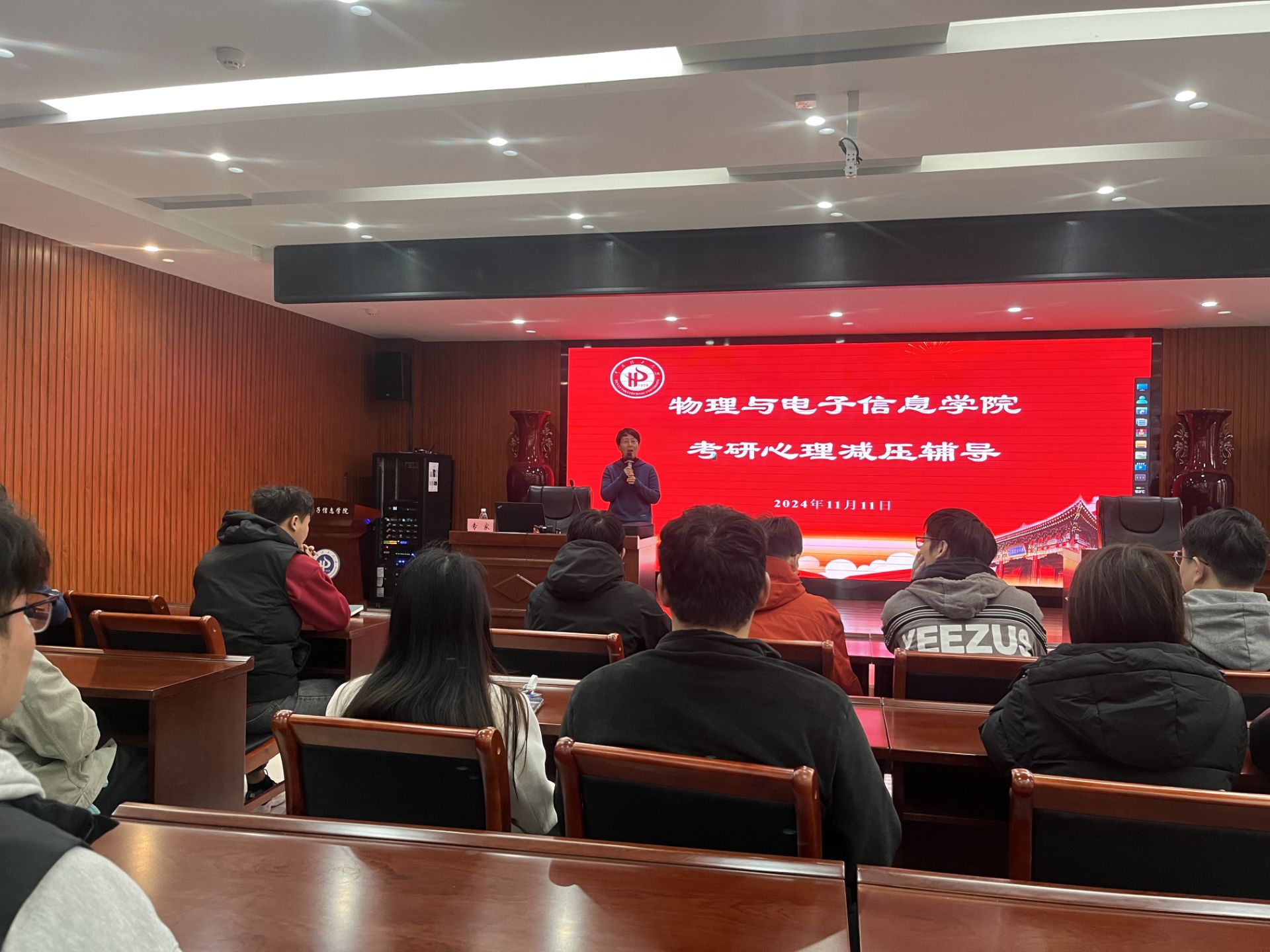 为帮助学生缓解考研压力,提升情绪调节能力,以轻松平常心态从容应考,11月11日,我院于226室开展考研心理减压辅导活动。本次活动特邀国家二级心理咨询师王燕担任主讲,2021级辅导员张代利、孙佳佳和2024届部分考研学生参会。
