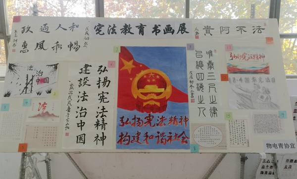 为宣传引导广大师生增强遵纪守法的自觉性,11月17日至18日,我院在物电楼二楼大厅组织开展宪法教育书画展。