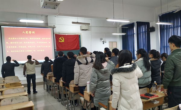 “我志愿加入中国共产党,拥护党的纲领,遵守党的章程,履行党员义务……”,12月25日下午,作为物电学院党委“不忘初心、牢记使命——牢记入党誓词、过集体政治生日”主题系列特色活动之一,学院党委在物电楼303教室举行了新一期预备党员宣誓仪式。学院党委副书记王丙新同志及专职组织员、学生党支部书记、学生正式党员代表、新一期预备党员参加了仪式。
