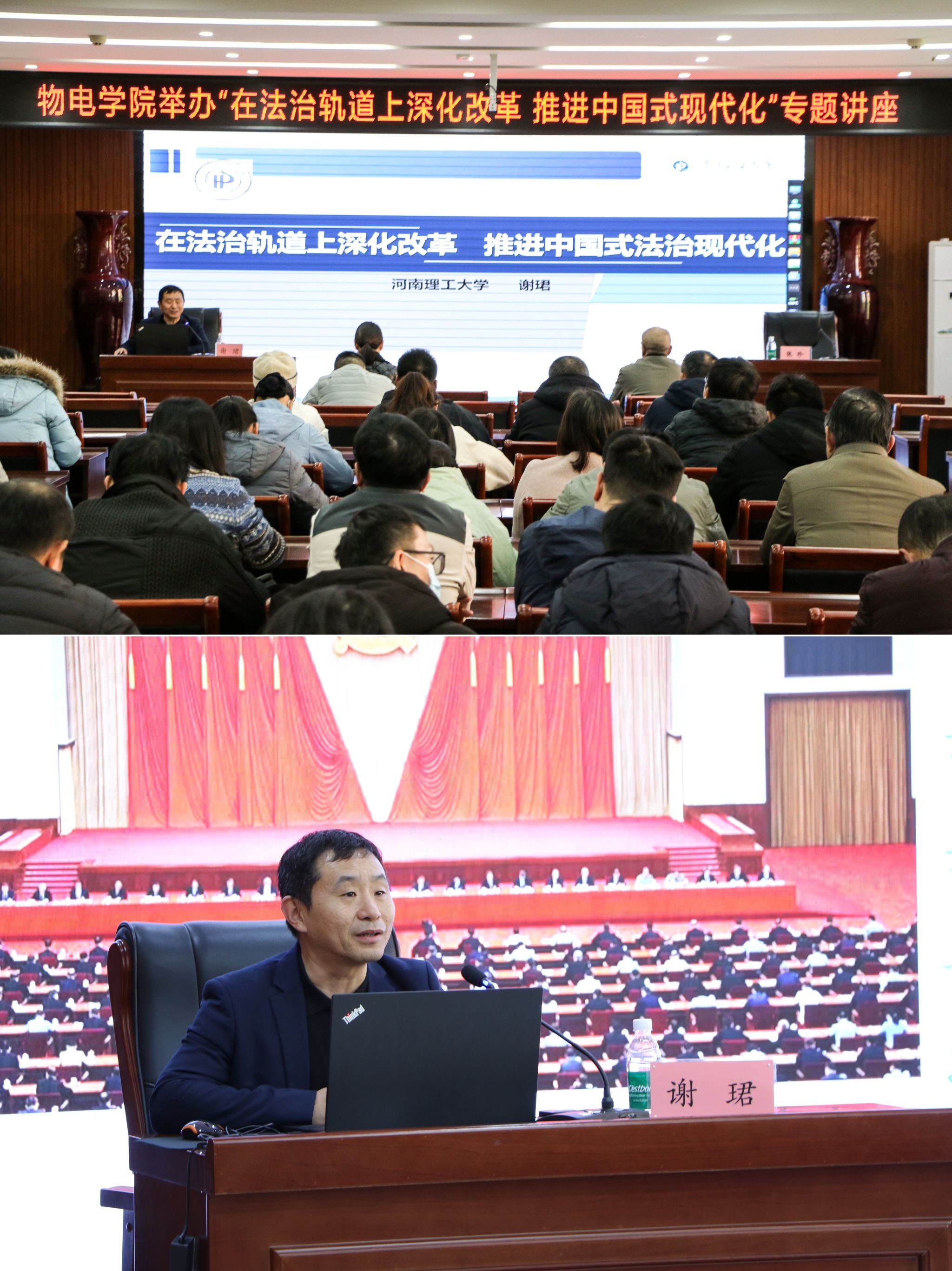 为深入学习贯彻党的二十届三中全会精神,进一步提升教职工法治观念和法律素养,11月26日下午,我院于综合实验楼226会议室举办“在法治轨道上深化改革 推进中国式现代化”专题讲座。本次宣讲特邀河南理工大学习近平法治思想研究中心主任、文法学院副院长谢珺作宣讲报告。会议由我院党委书记张珍主持,全体教职工参加会议。