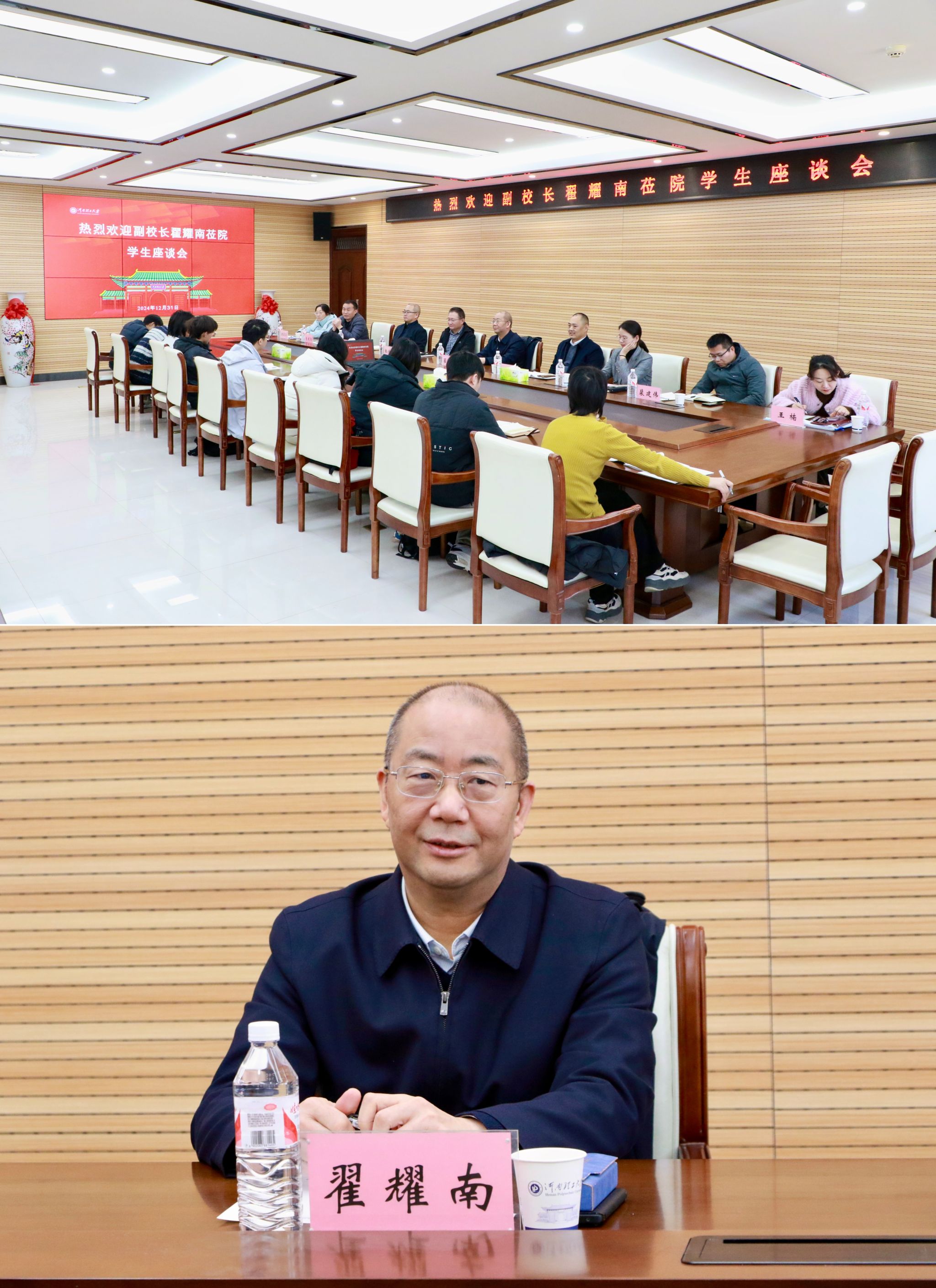座谈会伊始,翟耀南强调大学是同学们人生中重要的阶段,学校始终致力于为大家创造良好的学习环境和发展平台,并鼓励同学们敞开心扉,畅所欲言。随后,学生代表积极分享了入学以来的学习心得与生活体验,同时围绕兴趣发展、学习规划、职业选择等方面提出自身困惑。翟耀南认真听取大家的发言,结合个人经历,逐一给予详尽解答,展现出了对学生成长的深切关怀。最后,他向同学们提出四点期待:一要志存高远、胸怀家国,勇担时代使命;二要潜心向学、精研专业,锻造过硬本领;三要坚持锻炼、强身健体,培塑良好心态;四要明确方向、投身实践,挺膺青春担当。