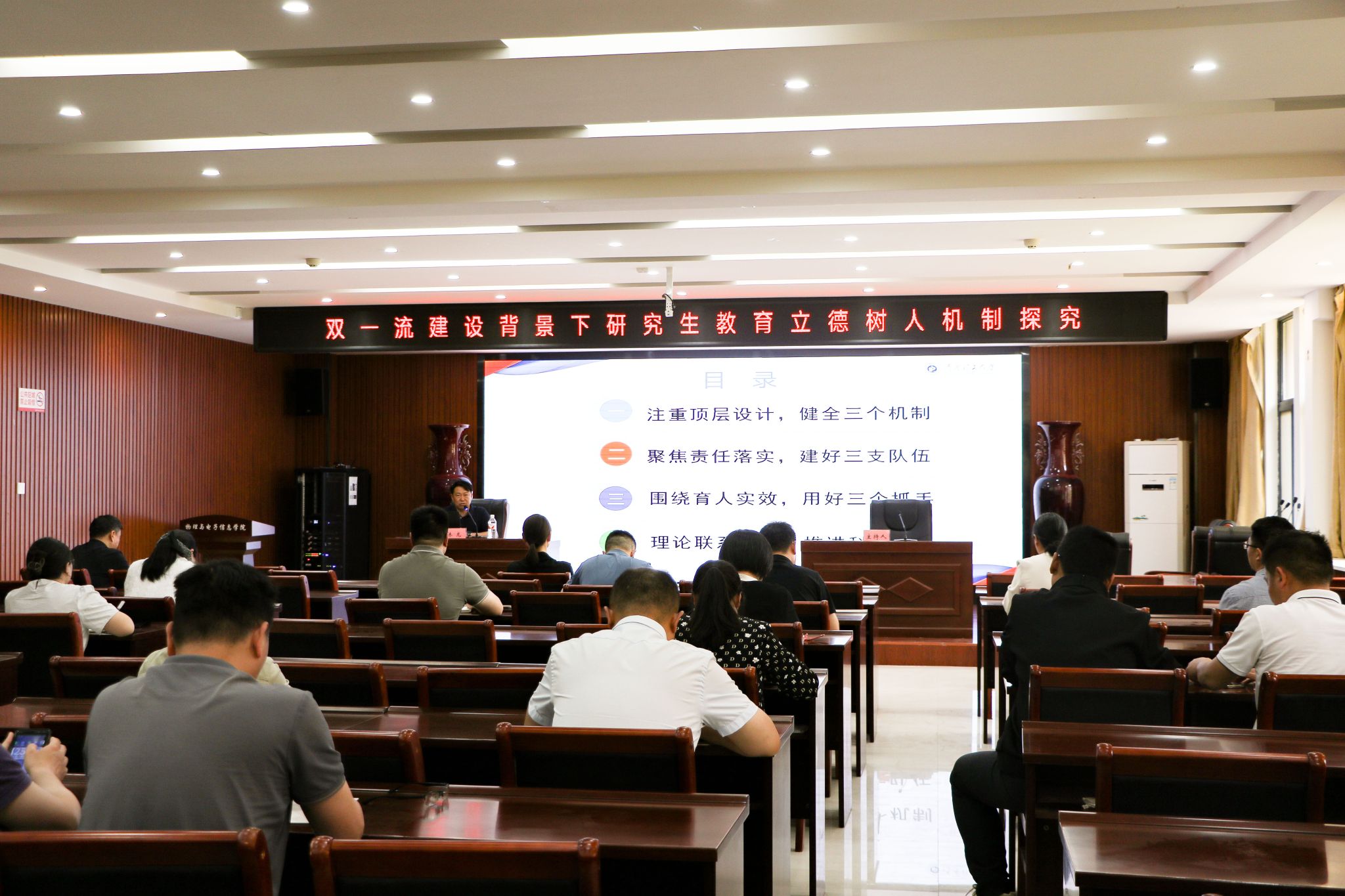 为扎实推进“双一流”建设任务落实落细,探讨研究生教育阶段落实立德树人根本任务的有效路径,5月6日下午,我院在综合实验楼226室成功举行了主题为“双一流建设背景下研究生教育立德树人机制研究”的学术报告。本次报告会特邀我校党委研究生工作部副部长(副院长)林龙亲临指导,我院全体研究生导师参与此次报告会议。