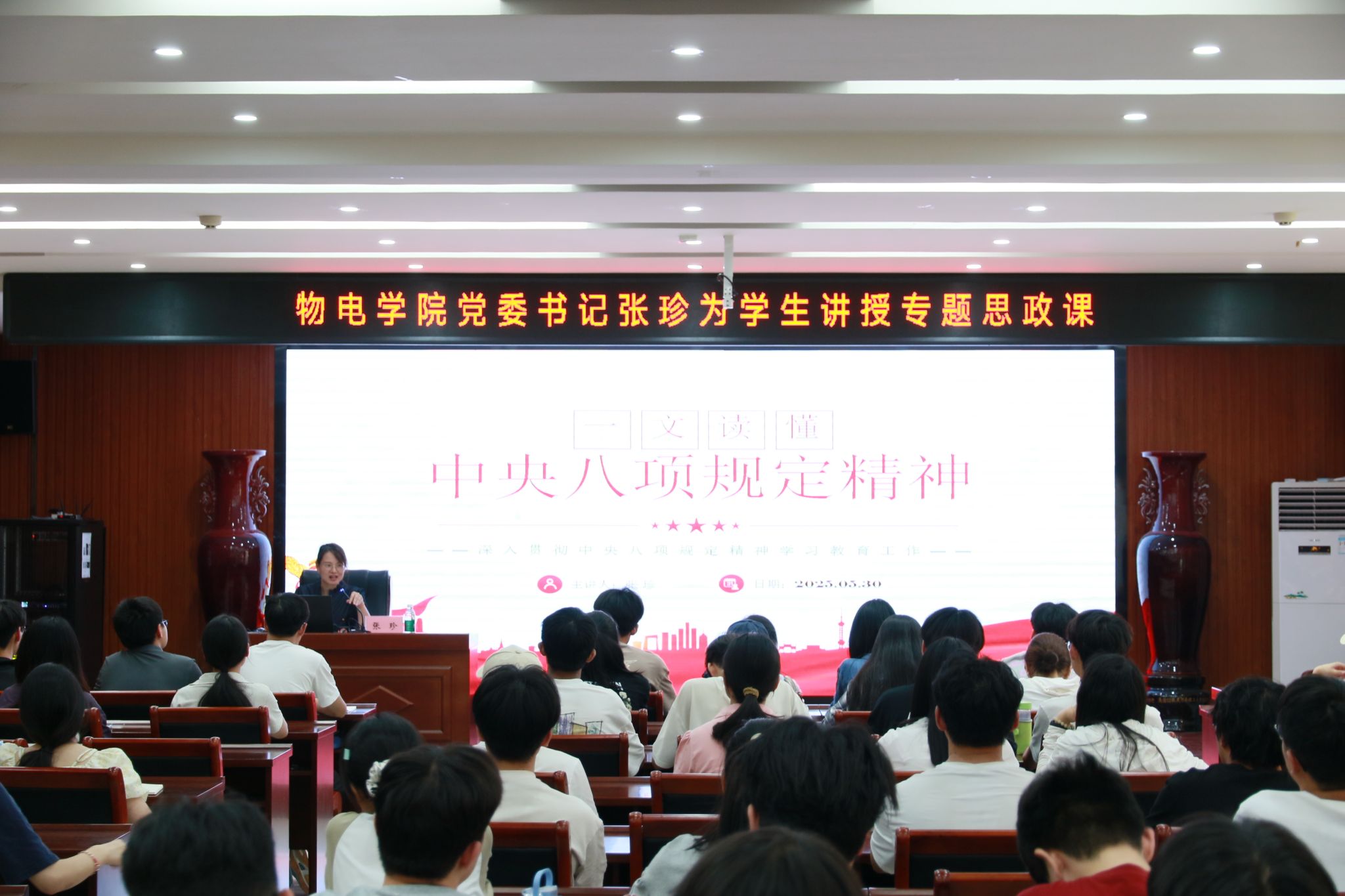 为持续深化作风建设,纵深推进全面从严治党,5月30日,我院在综合实验楼226室组织开展深入贯彻中央八项规定精神学习教育专题党课。本次党课由学院党委书记张珍主讲,全院入党积极分子、预备党员和部分学生代表参与会议,共学纪律准则,共筑思想防线。