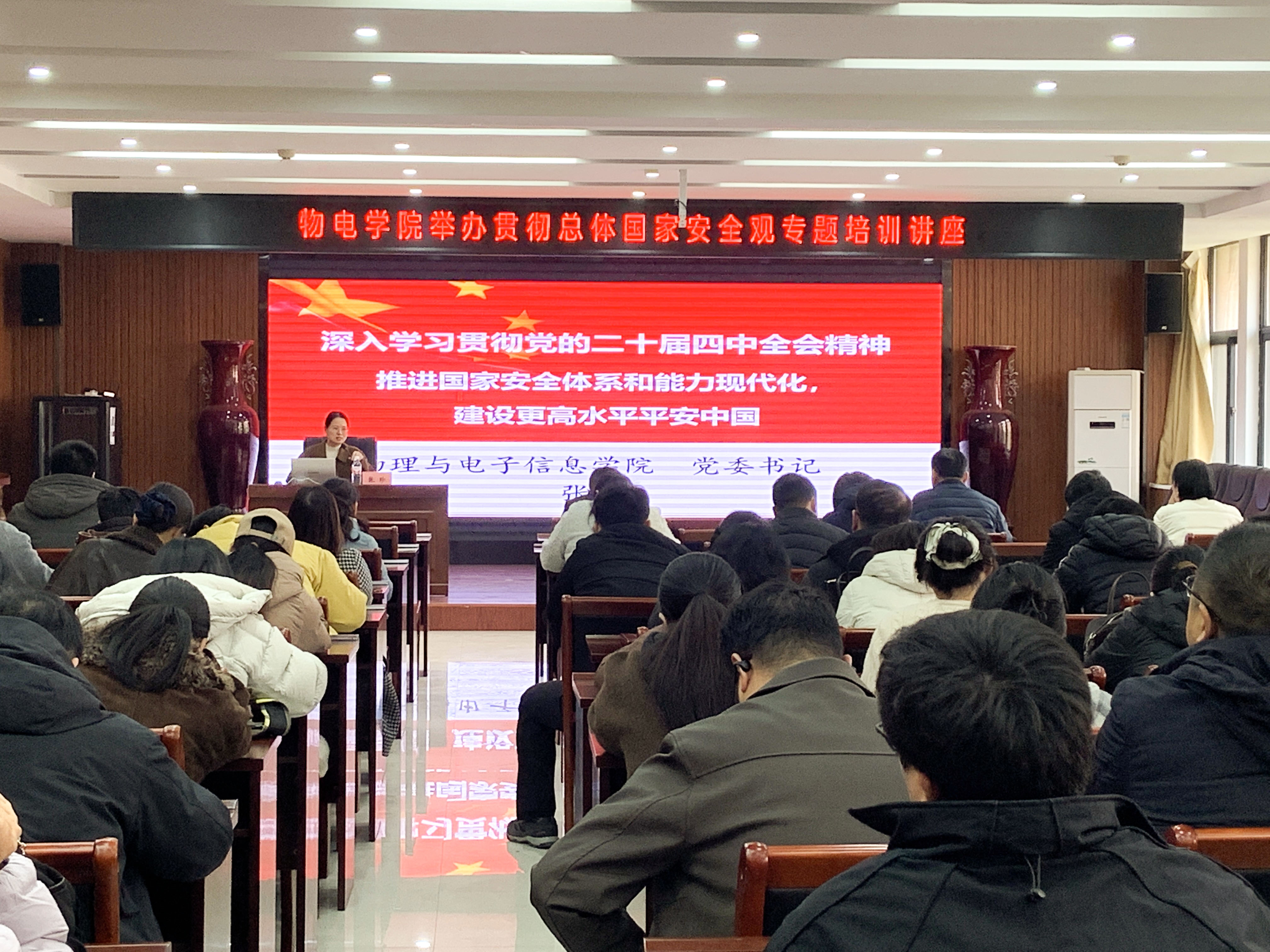 为深入学习贯彻党的二十届四中全会精神,扎实推进总体国家安全观进校园、进课堂、进头脑,全面提升教职工安全意识与风险防范能力,3月10日下午,我院于综合实验楼226室举办贯彻总体国家安全观专题培训讲座,此次讲座由学院党委书记张珍主持,全体教职工参加学习。